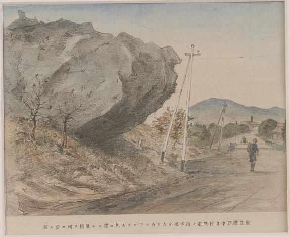 東置賜郡中山村新道ノ内字掛ケ入リ石ノ下ヨリ大川ニ架スル境橋ヲ南ニ望ム図