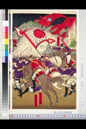 「征清美淡名誉鑑」 「斎藤少佐地雷火を仕掛んとする豚兵を一刀勇に切る図」
