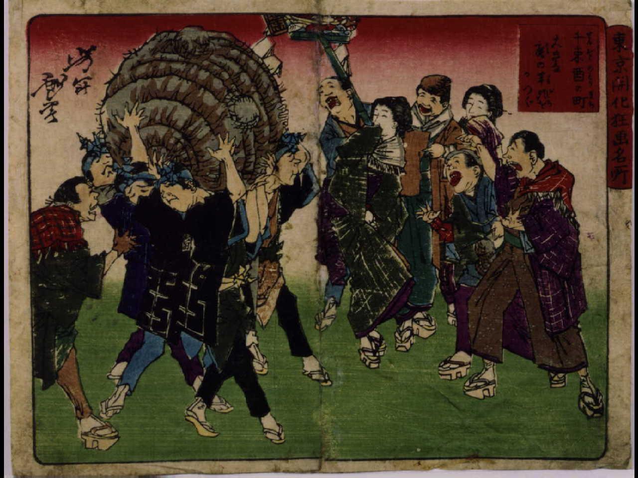「東京開化狂画名所」 「千束酉の町 大きな唐の芋頭をかつぐ」「日暮里布袋 世界第一三腹対」