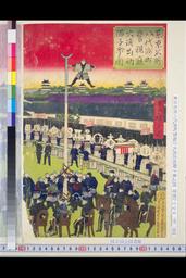 「東京名所八代洲町警視庁火消出初階子乗之図」