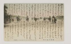 People in a celebratory mood after war victory. People hail the Imperial Army at Kumano Shrine in Kanazawa Village