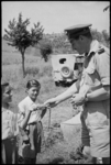 Captain A Simpson gives chocolate to two Italian girls in the artillery lines near Sora, World War II - Phot...