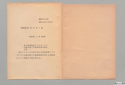 来日英国皇族アレキサンドラ内親王殿下の国賓待遇に関する件