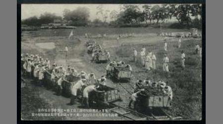 佐賀市々民運動場建設土盛工事・佐賀中學奉仕作業、昭和十五年八月六日灼熱の炎天下・關係市當局状況視察の日