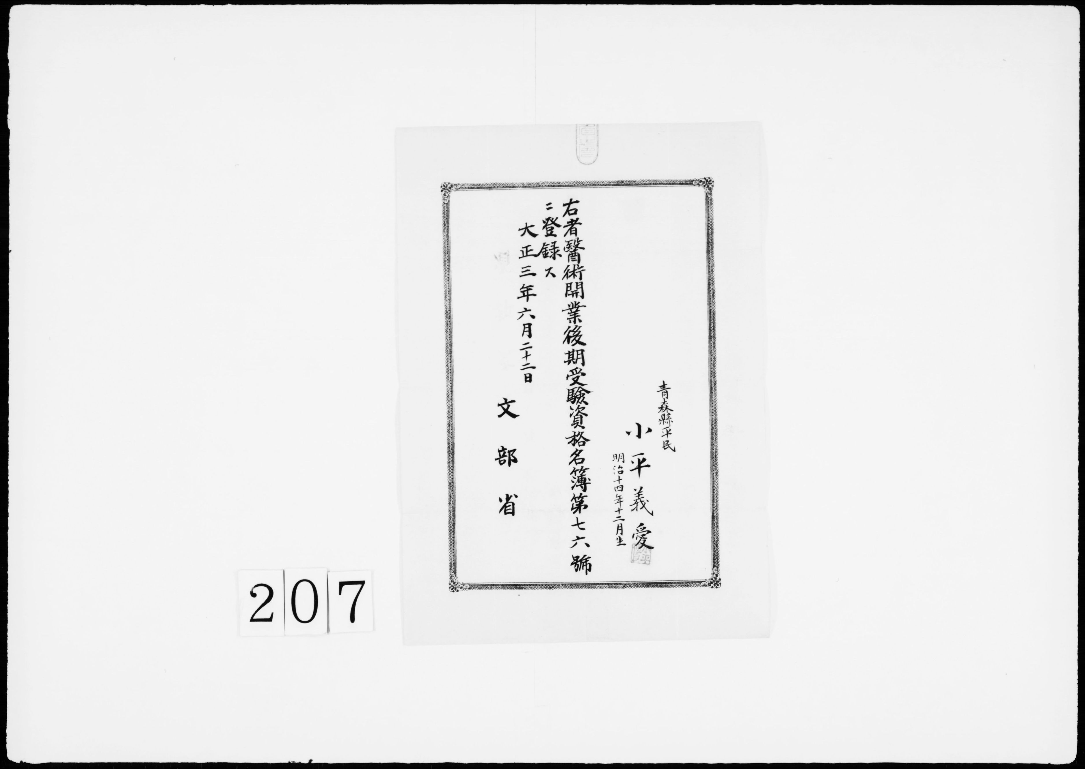 医術開業後期受験資格名簿登録証
