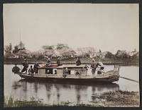 Japans gezelschap in een boot liggend voor stenen beschoeiing aan de waterkant