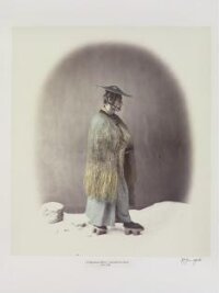 Studioportret van een wijn offerende Shintopriester