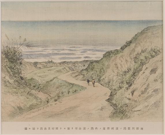 飽海郡三崎新道ノ内有耶無耶ノ関趾切リ割ヨリ南ニ海面ヲ望ム図