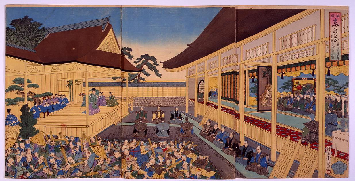 「温故東之花第三編旧幕府御大礼之節町人御能拝見之図」 「温故東之花第三編旧幕府御大礼之筋町人御能拝見之図(三枚続)」