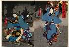 「踊形容外題尽 晴模様染衣更着 第壱番目五立目 伊賀守館の場 園部の左衛もん 奥がた松が枝 伊賀守」「安政五戊午年二月大吉日」