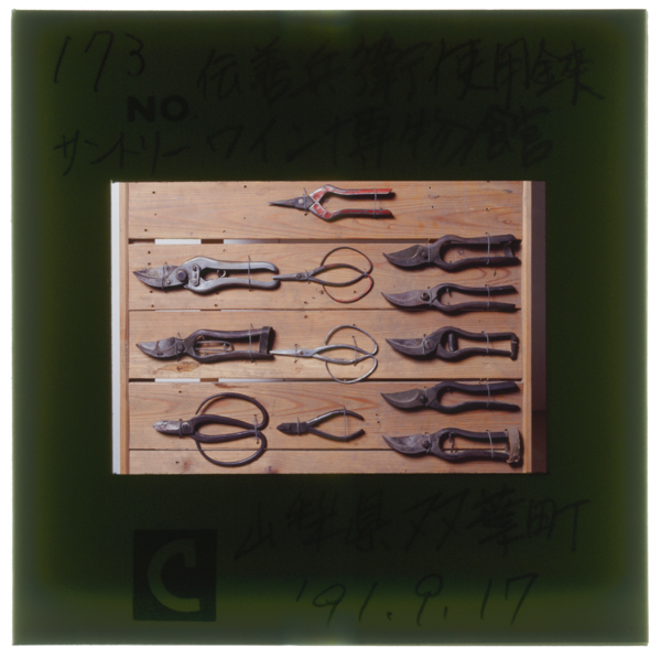 (下)善兵衛が登美農園で使ったといわれる剪定鋏(サントリー山梨ワイナリー・ワイン博物館)。