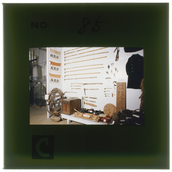 郷土館に展示された錦織綱場用具 数百年にわたる綱場の歴史は今も町の人々の誇りである 左端は留綱に使われた白口藤