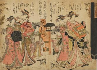 The Courtesan Nanaya of the Kadokanaya Brothel with her Two Kamuro, series Models for Fashion: New Designs as Fresh as Young Leaves (雛形若菜初模様)