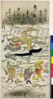 Courtiers and attendants crossing bridge from 36 immortal women poets in printed brocades (Nishikizuri onna sanjūrokkasen)