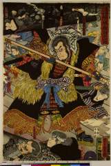 (老猿を退治する源為朝)[肥後国阿蘇郡阿曽三郎平忠国の娘白縫姫 年来畜狎し老猿侍婢若葉に戯れ つひにくひ殺して逃出 同国文珠院の塔上に走りのぼり主を辱しむ 御曹司の神鶴謀りて猿を衝 忠国感じて女児白縫為朝へ婚姻契約の図」 ) 「松浦二郎」「高岡四郎」「高岡三郎」「阿曽三郎平忠国」「文珠院賤事僧」「吉田兵衛」「乎取ノ与次」「乎取与三郎」「大矢新三郎」「●●神鶴」