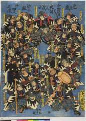 「忠臣蔵十一段目 夜討之義士 追手組廿四人之像」 「太田六右エ門助武」「松村喜平秀直」「原郷右エ門元辰」「千崎弥五郎則休」「竹森貞七隆重」「勝田真左エ門武尭」「岡崎八千右衛門常時」「片山源二右エ門高房」「川瀬忠太夫正明」「堀江矢兵衛兼丸」「遠森祐右エ門正因」「海賀八右エ門友信」「岡野銀右エ門包秀」「速水惣左エ門満尭」「大星由良之助良雄」「立川勘兵衛家利」「知加松文六行重」「小寺孝右エ門秀富」「遠久田彦太夫重森」「味村三郎右エ門包常」「加頭与茂七教金」「芳田作右エ門兼定」「矢間重太郎光奥」「大鷲伝吾忠雄」