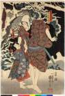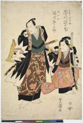 Arashi Otokichi as Iwanagazaemon, Onoe Monzaburō II as Chichibu Shigetada and Ichikawa Danzaburō IV as the Beautiful Courtesan Akoya