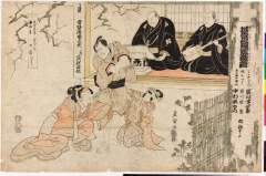 「其常磐津仇兼言」「文化九年春狂言 古今の大あたり/\」 「みのや三かつ 岩井半四郎」「あかねや半七 中村歌右衛門」「娘おつう 市川助蔵」「浄瑠理 常磐津兼太夫」「三弦 岸沢式佐」