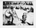 『カリカチュラーナ』:(81)金はいらんか、銀がいいか、ダイヤモンドならどうだ、それとも10億の現ナマか?ええい持ってけどろぼう・・・どおん!どおん!どおんどおんどおん!!こっちは瀝青、そっちは鋼鉄、鉛だ金だ紙だ、亜えーんメッキのてつうううう・・・さあさあ寄ってらっしゃい、見てらっしゃい、とにかく善は急げだ、お急ぎを。法律が変わっちゃうよ。みんな失くなっちゃうよ。さあ急いだ急いだ、早い者勝ちだ。さあ株を買った買った!!(音楽で景気づけだ)どおん!どおん!どおんどおんどおん!!どおん!どおん!!