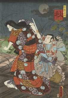 Sawamura Kunitaro as Ayame no Mae and Arashi Kitsuzaburō as Hyōgo no Kashira Yorimasa