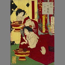 The Goddess Benten Holding a Biwa and a Young Man Holding a Shoulder Drum, from the series "Comparing the Smiles of the Lucky Gods (Fukujin egao kurabe)"