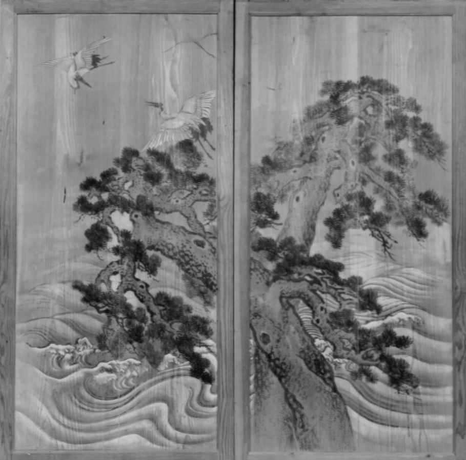 杉戸著色波松に鶴図