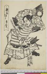 The Actors Nakamura Takesaburo I as Kewaizaka no Shosho and Ichikawa Danjuro II as Soga no Goro dressed as a komuso in the play "Bando Ichi Kotobuki Soga," performed at the Nakamura Theater in the first month, 1715
