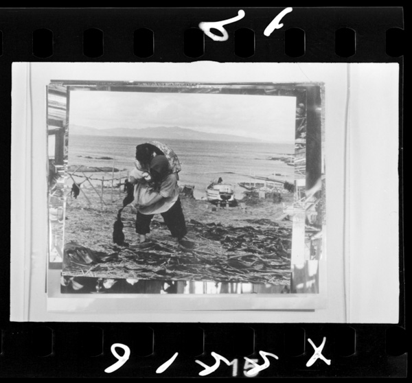 流れコンブを拾う,向うに見えるのは礼文島.北海道利尻島