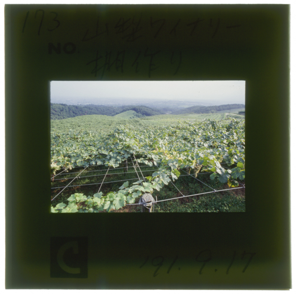 サントリー山梨ワイナリーのブドウ畑(山梨県双葉町)。総面積150ha。鳥井信治郎と川上善兵衛が協力して開いた登美農園の今日の...