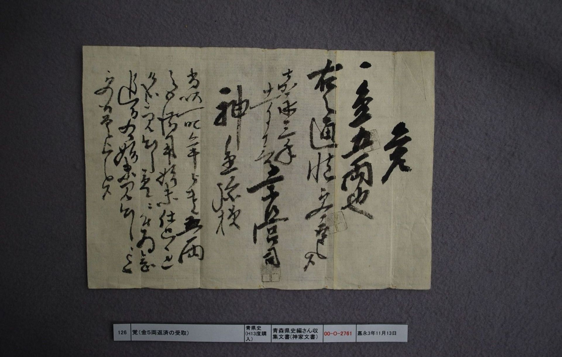 覚(金5両返済の受取)