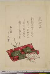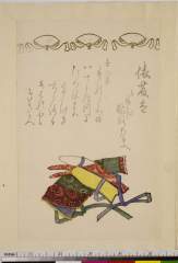 Auspicious Day for Travel (Tabidachi yoshi) with Sword, Scarf, Hat and Boxes, from the series Ise Calendar for the Asakusa Group (Asakusa-gawa Ise goyomi), with poem by Asakusa-an Buntsu