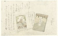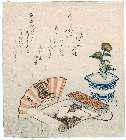 Chapter Six (Roku dan) represented by Hat and Fan, from the series Tales of Ise for the Asakura Group (Asakusa-gawa Ise monogatari), with poems by Amihiko and associates