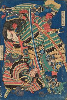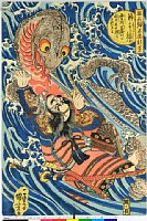 Nitta Yoshisada Throwing Sword into the Sea (Inamura ga Saki ni Yoshisada wadatsumi e hakase sasage tamō), from the series Chronicles of Kamakura (Kamakura shi), with poems by Tawara Mitsumori and Chobotei no Kojin