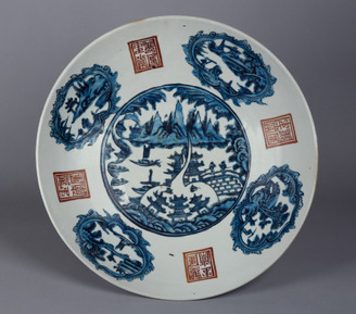Round Large Dish with Landscape, Pavilion, and Seals Zhangzhou ware