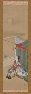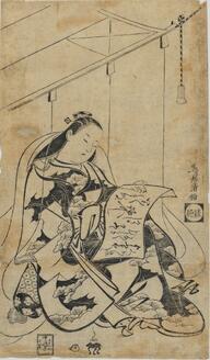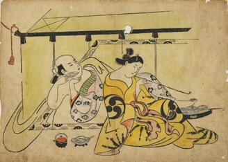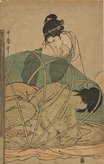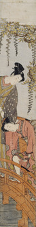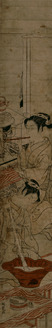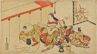 The courtesan Ayame of the Matsuba-ya and an attendant playing with a puppet
