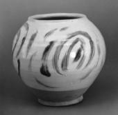 黄地白彩紫彩流文大丸壺