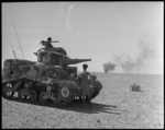Stuart tank with smoke from burning Messerschmitt 109F in the background, Egypt - Photograph taken by H Paton