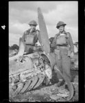 New Zealand soldiers in England during World War II, with a plane brought down by the Royal Air Force