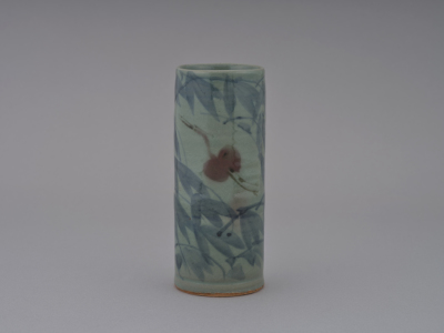 青磁竹鷺筒花入