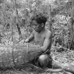 Man weaving plant fibre to create a basket-like item, Malaya