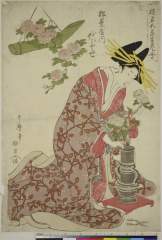 Woman Dressing/ It is Favorable to Don New Clothes (Kisohajime yoshi), from the Series for the Hanazono Group (Hanazono bantsuzuki), with poems by Ryūsuitei Sodezumi (from Sendai) and Senryūtei (from Sendai)