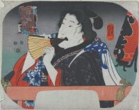 Actor Nakamura TOSSHO AS A WOMAN IN A GREY FURISODE READING AN UNROLLED SCROLL