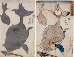 「其面影程能写絵」 「猟人にたぬき・金魚にひごいッこ」
