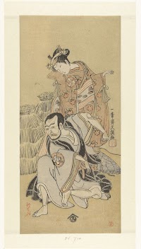 Nakamura Sukegorō I as ōmori Hikoshichi and the Onnagata Actor Nakamura Tomijūrō I as Shirabyōshi, Kasugano-no-Fuji
