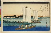 Ferry Boats Approaching the Government Barrier at Arai, series Pictures of Famous Places on the Fifty Three Stations (五十三次名所図会(竪絵東海道))