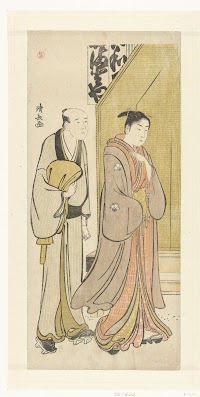The Actors Nakamura Nakazo I as Tenjiku Tokubei (?) (right) and Bando Kumajuro as the Shopman Dempachi (?) (left), in the Play Keisei Katabira ga Tsuji (?), Performed at the Ichimura Theater (?) in the Eighth Month, 1783 (?)