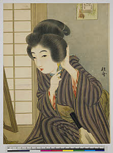 鏡の前 髪梳る女
