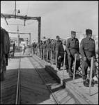 NZ soldiers walking single file across the swing bridge in Taranto, Italy, World War II