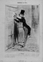 『日々のカリカチュア』:サロンのブルジョワ さてと、まてよ・・・、こりゃ、いったいなんだ?・・・(カタログをみる)『387番、株式仲買人B・・・氏の肖像』・・・ふーん・・・ふぅーん!・・・おや!なーんだ、ばかだね、わたしゃ。そりゃ386番だよ。B・・・氏の肖像は。これは、『ブラスカサ氏による牡牛の肖像』なんだな・・・。それにしてもなぁ・・・、こんなでっかい角を生やして描かれたいもんかねぇ・・・。こんな調子でみんなの注文をほいほいきいてるようじゃ、どうりでこの画家は、株屋さんにもいやとは言えなかったわけだな