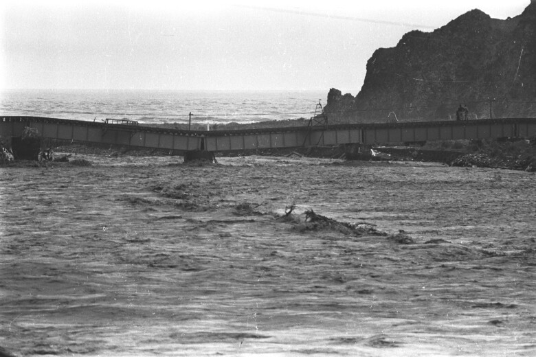 昭和47年7月豪雨で増水した追良瀬川と決壊した五能線の鉄橋